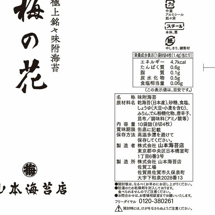 商品名の「梅の花」は、山本海苔店の創業の頃、江戸前のおいしい海苔は、梅の香ただよう寒中に採取されていたことに由来しています。