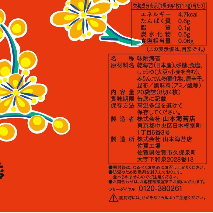 商品名の「梅の花」は、山本海苔店の創業の頃、江戸前のおいしい海苔は、梅の香ただよう寒中に採取されていたことに由来しています。